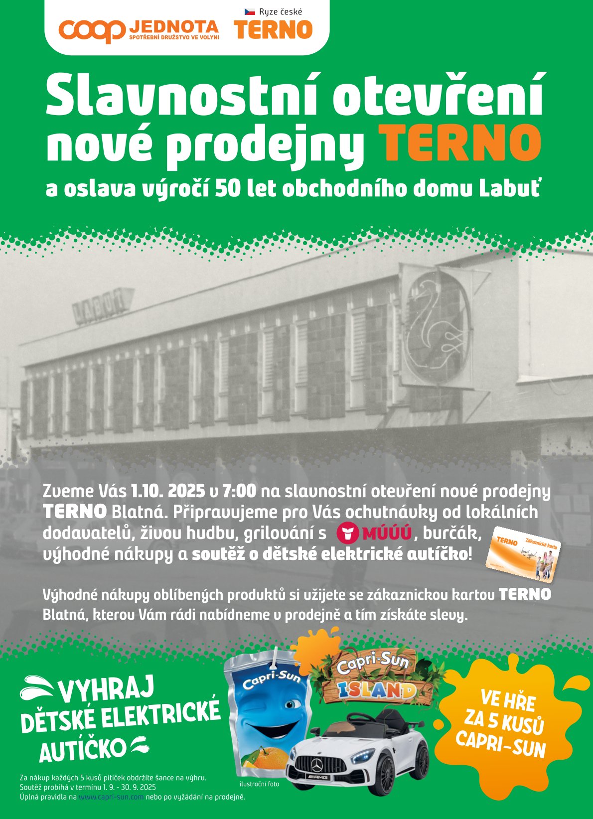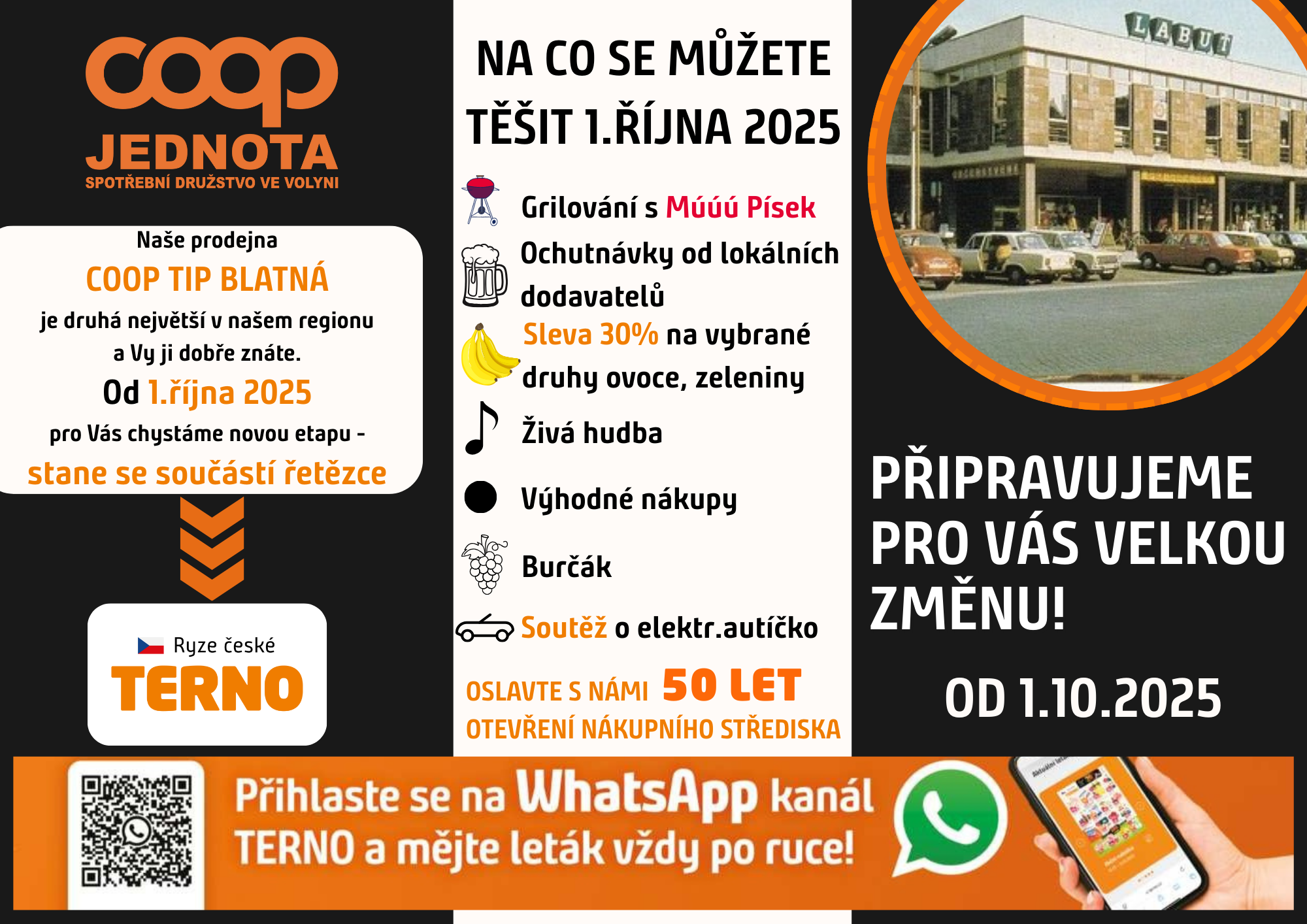 Naše prodejna COOP TIP Blatná od 1. října 2025 vstupuje do nové éry – stává se součástí ryze českého řetězce TERNO.
