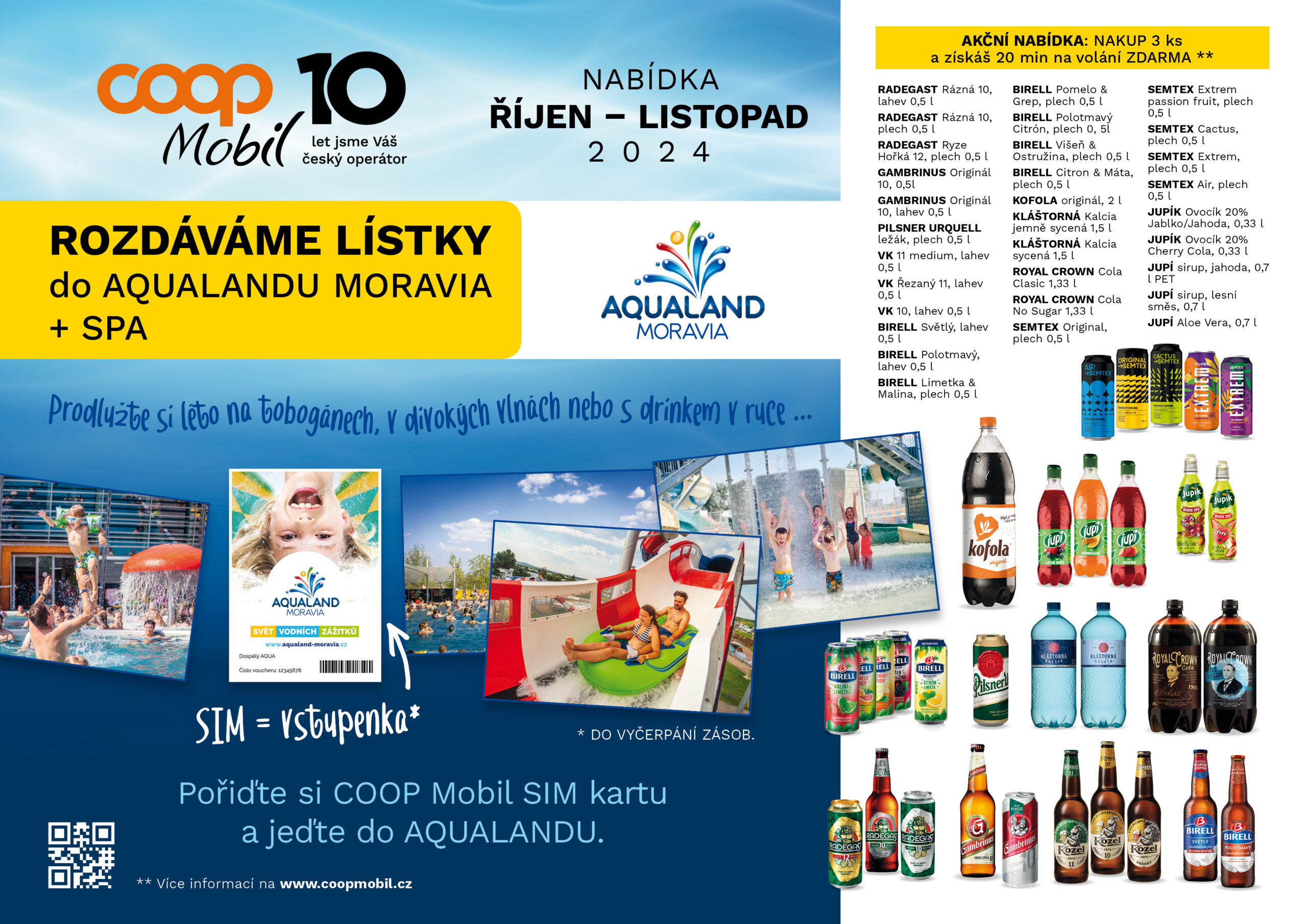 Navíc stále rozdáváme lístky do Aqualand Moravia, tak proč si neprodloužit léto 🌞🌊🧉🍹 Pořiďte si COOP Mobil SIM kartu v e-shopu v období srpen – listopad 2024 a jeďte na celý den do AQUALANDU. Pokud v daném období zároveň dobijete minimálně 150 Kč, máte možnost získat další lístek do AQUALANDU.
