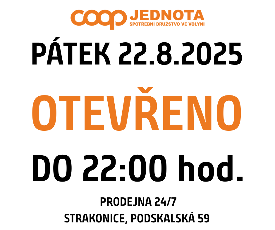 V pátek 22. 8. 2025 má prodejna 24/7 Podskalská, Strakonice otevřeno do 22:00 hod.!